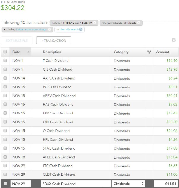 Dividend Income November 2019 November 30, 2019DividendsDividend Journal Forward 12 month estimated dividend income: $3,223.97 Share this: Click to share on X (Opens in new window) X Click to share on Facebook (Opens in new window) Facebook Like Loading... Related