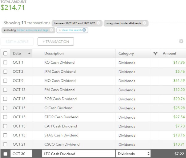 Dividend Income October 2020 October 31, 2020DividendsDividend Journal Forward 12 month estimated dividend income: $3,329.37 Share this: Click to share on X (Opens in new window) X Click to share on Facebook (Opens in new window) Facebook Like Loading... Related