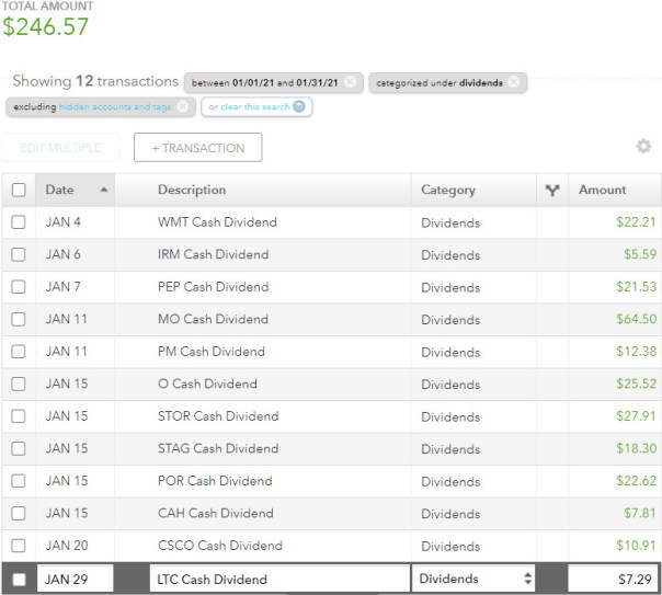 Dividend Income January 2021 January 31, 2021DividendsDividend Journal Forward 12 month estimated dividend income: $3,467.72 Share this: Click to share on X (Opens in new window) X Click to share on Facebook (Opens in new window) Facebook Like Loading... Related
