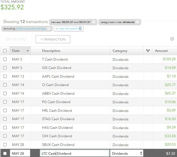 Dividend Income May 2021 May 31, 2021DividendsDividend Journal Forward 12 month estimated dividend income: $3,857.67 Share this: Click to share on X (Opens in new window) X Click to share on Facebook (Opens in new window) Facebook Like Loading... Related